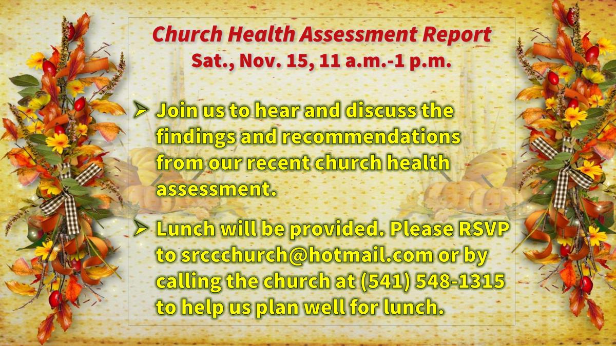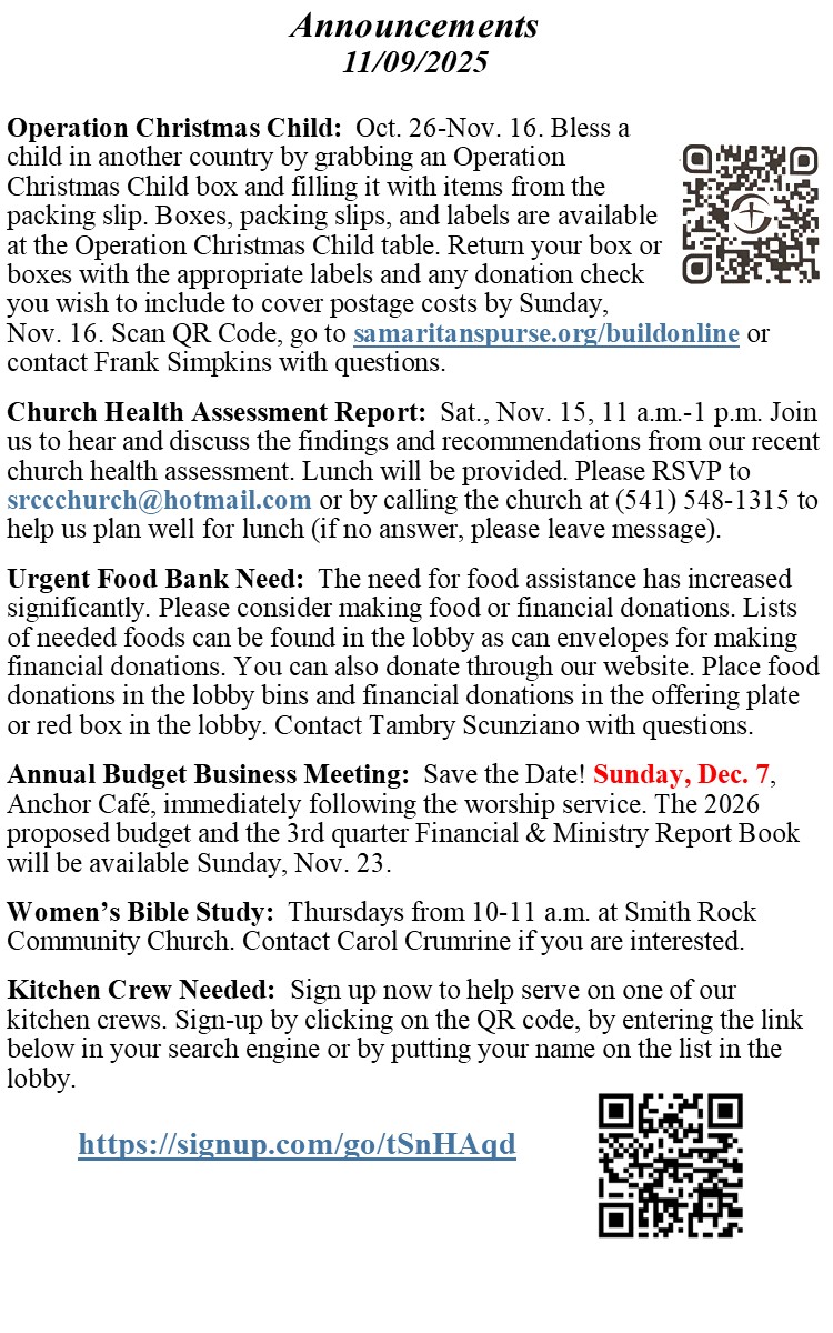 Following Nick’s retirement, we are looking for a new worship leader. Please pray for the process of finding someone to fill his capable shoes. If you are interested, please provide a resumé and one-page philosophy of worship ministry to Pastor Todd at srccchurch@hotmail.com.